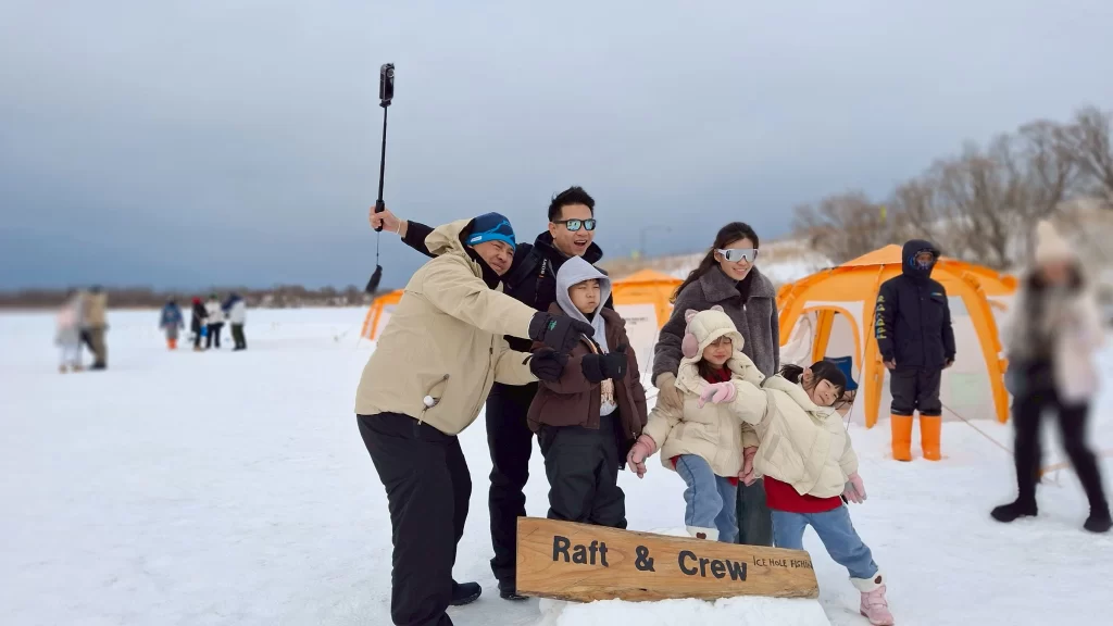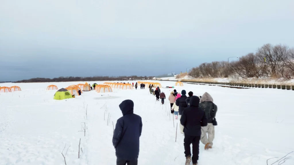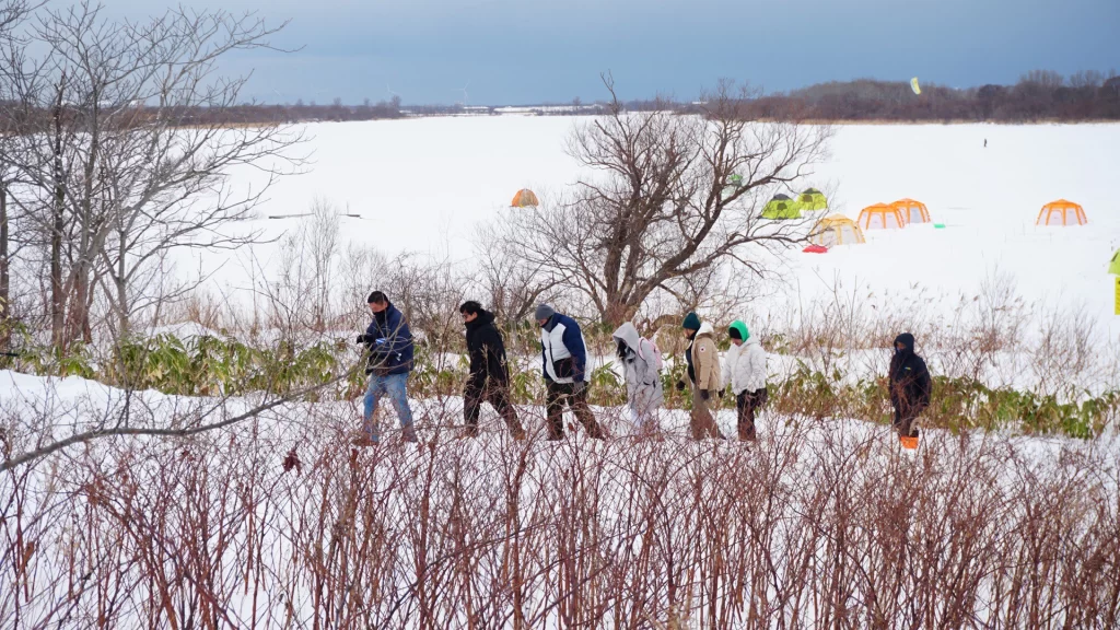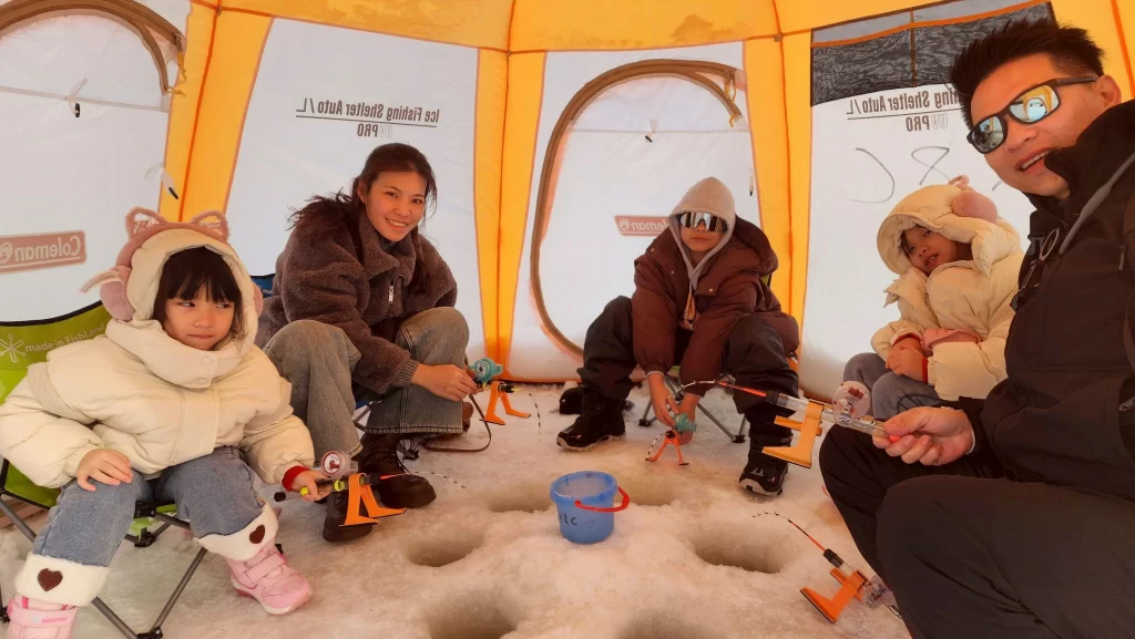- ลานกิจกรรมตกปลาน้ำแข็ง การตกปลาวะคะซะงิ จะมีวิธีตกที่แตกต่างไปเล็กน้อย คือจะตกจากพื้นน้ำแข็ง โดยทุกท่านจะทำการเจาะรูที่พื้นน้ำแข็งบนทะเลสาบ และหย่อนเบ็ดลงไปในรูเพื่อตกปลาวะคะซะงิ (wakasagi) ที่ว่ายน้ำอยู่ใต้ผืนน้ำแข็ง